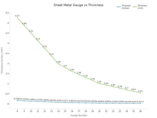 Plåtens tjocklek är viktig. Den påverkar slutproduktens styrka och flexibilitet. Tabellen nedan visar vanliga plåttjocklekar och deras tjocklek i tum och millimeter: